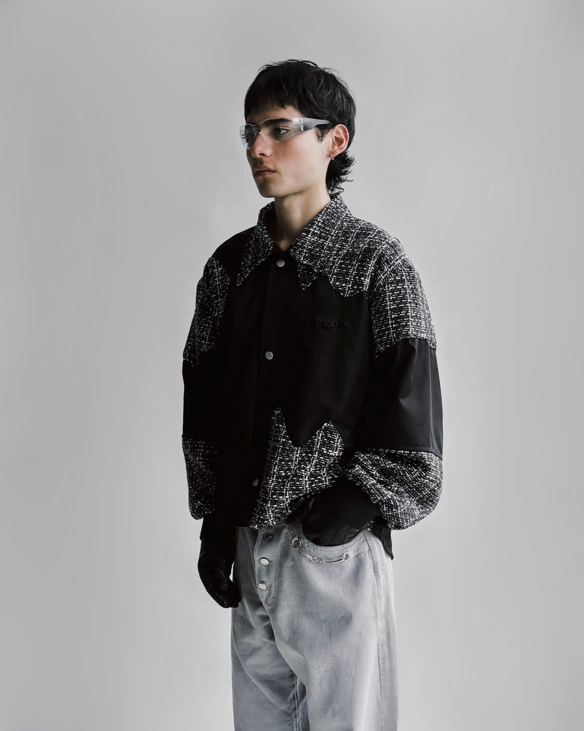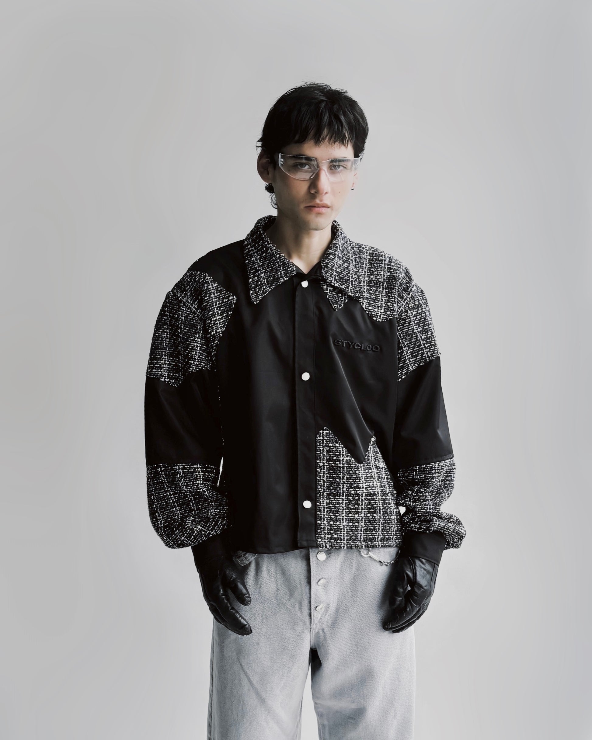 Una reinterpretación del lujo streetwear. Esta chaqueta abotonada fusiona una base técnica en negro mate con paneles de tejido texturizado en contraste. Detallada con el bordado tonal STYCLOO en el pecho y herrajes metálicos. Una silueta estructurada diseñada para elevar cualquier conjunto.